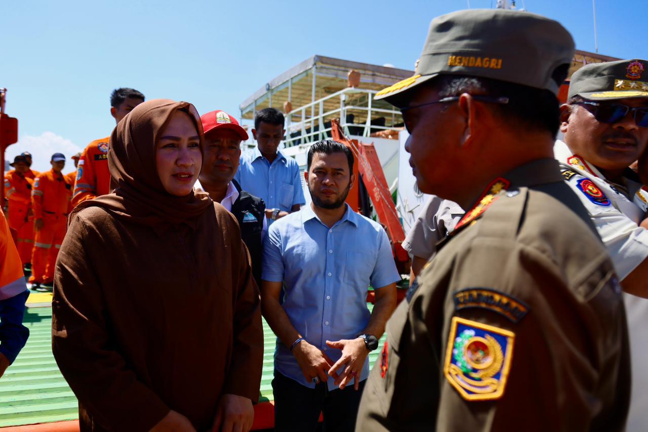 Aceh Utara – Ketua TP PKK Aceh, Marlina Muzakir, mendampingi Menteri Dalam Negeri RI, Tito Karnavian, saat meninjau kesiapan Pelabuhan Krueng Geukueh, Minggu (30/11/2026). Peninjauan ini dilakukan untuk memastikan jalur laut dapat menopang distribusi logistik bagi wilayah terdampak banjir dan longsor di Aceh.