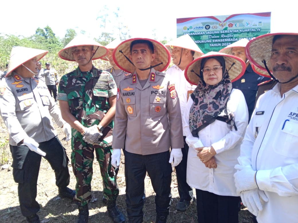 Kota Jantho -newsceoaceh_ Kepala Dinas Pertanian Aceh Besar Jakfar, SP, M. Si turut mendampingi Wakil Bupati Aceh Besar Drs Syukri A Jalil dan Kapolda Aceh Irjen Pol. Drs. Marzuki Ali Basyah, M.M pada penanaman jagung secara serentak di Desa Suka Damai, Saree, Kecamatan Lembah Seulawah, Rabu, 08/10/2025.