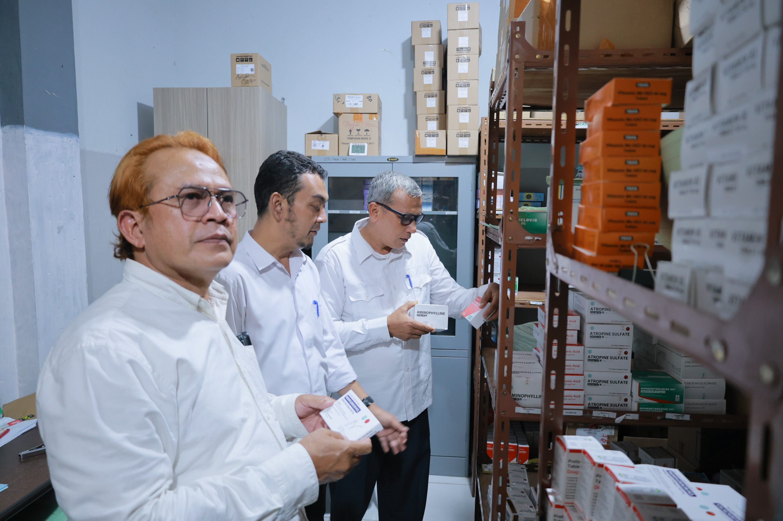 Asisten III Sekda Aceh Besar, Abdullah SSos didampingi Direktur RSUD Aceh Besar dr. Bunaiya MKM dan Kabag Hukum Rafzan SH MH saat meninjau gudang Farmasi RSUD Aceh Besar, Rabu (22/4/2026). FOTO/MC ACEH BESAR